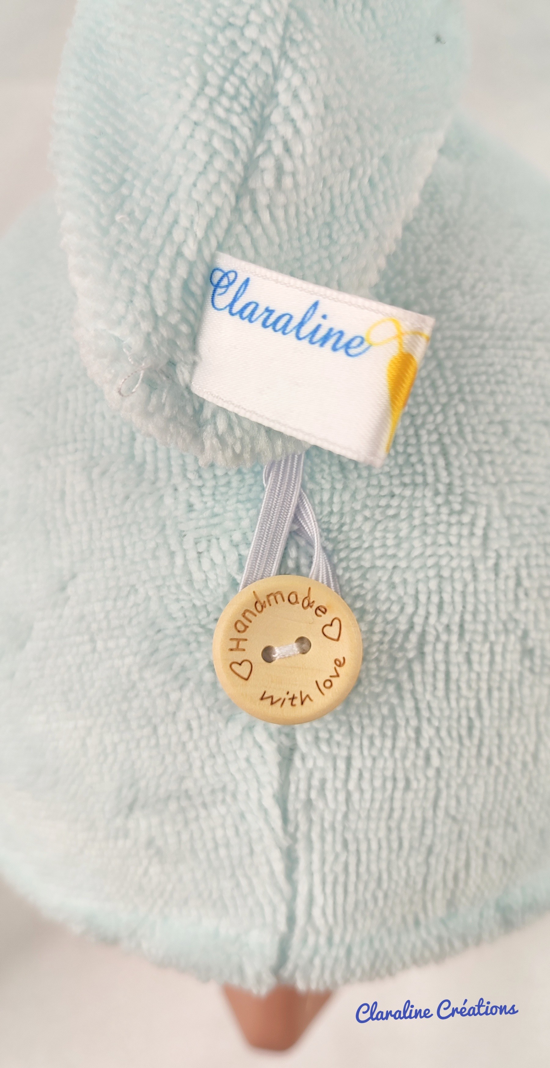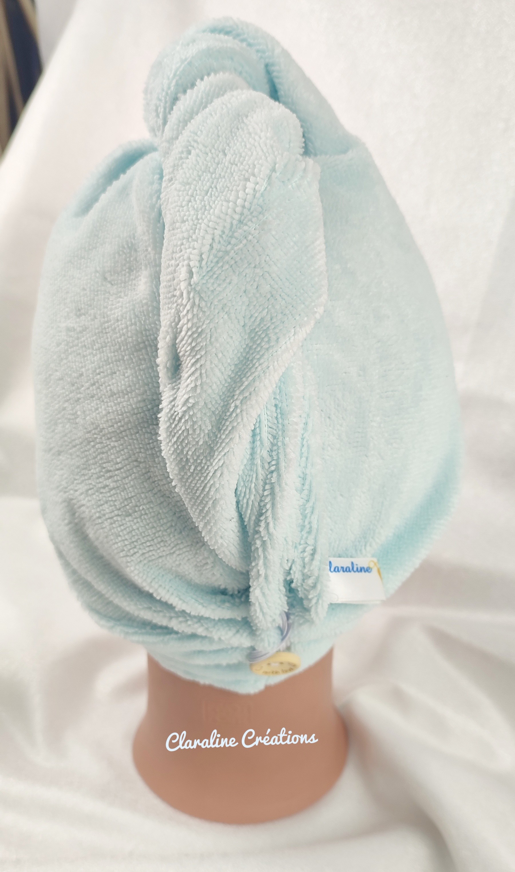 - soit avec le bouton sur le haut de la tête, on tourne la serviette qu'on ramène sur le dessus de la tête, et on l'accroche à l'aide du bouton et de l'élastique